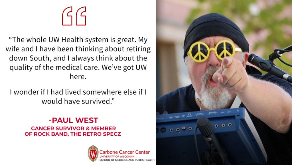 West also praises his treatment team, especially Dr. Randy Kimple, his radiation oncologist at the UW Carbone Cancer Center. “Randy told me, ‘I want you to get this many calories a day, so make it happen. You have to do this.’ He’s a great a doctor—very nice and a cool guy—but he’s tough too,” West says. “Every time I go see Randy, I’m like, ‘Dude, thank you. I appreciate everything you’ve done for me. You saved my life.’